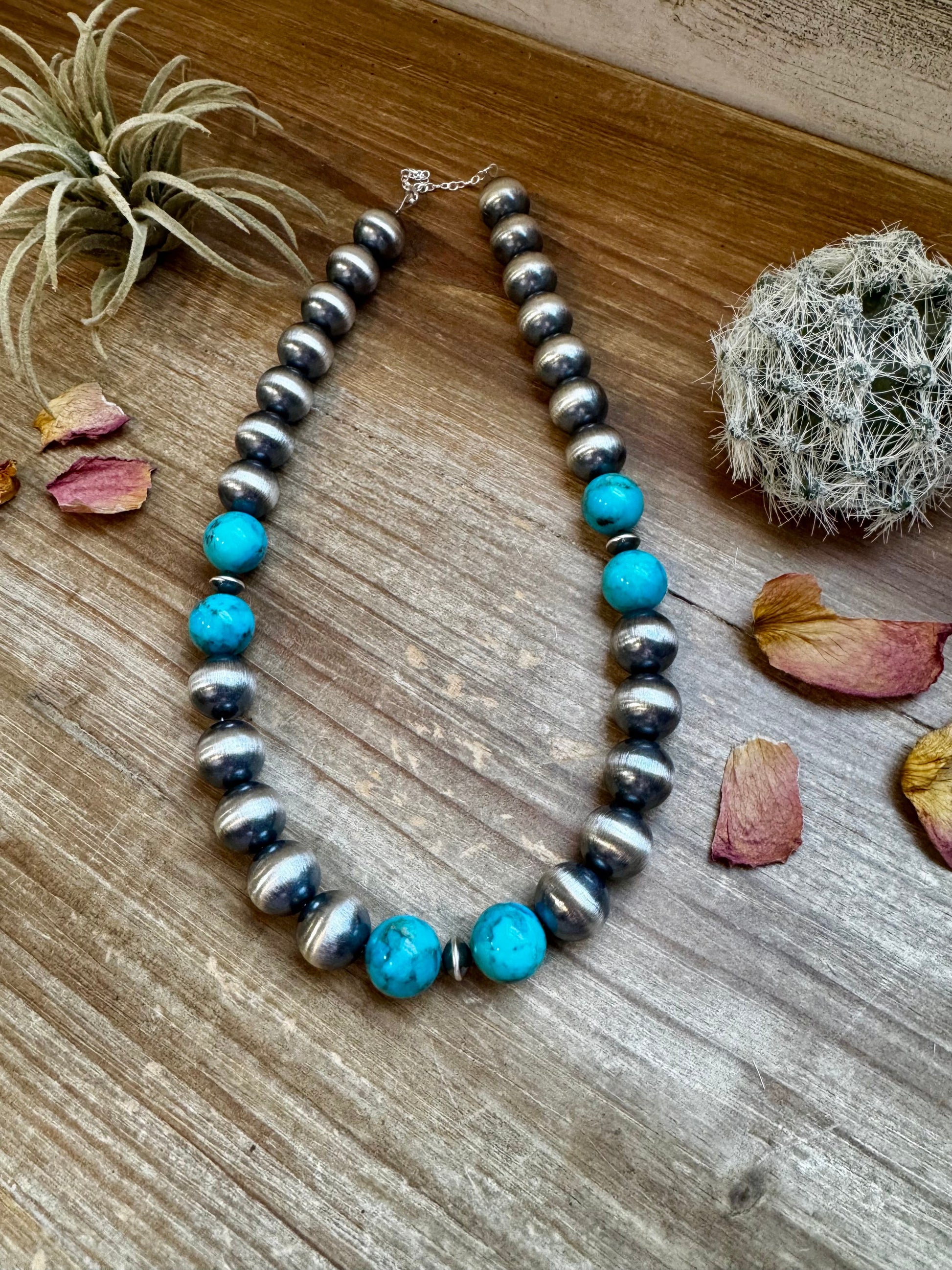 18 Inch 14 mm Sterling Silver Pearls necklace with turquoise