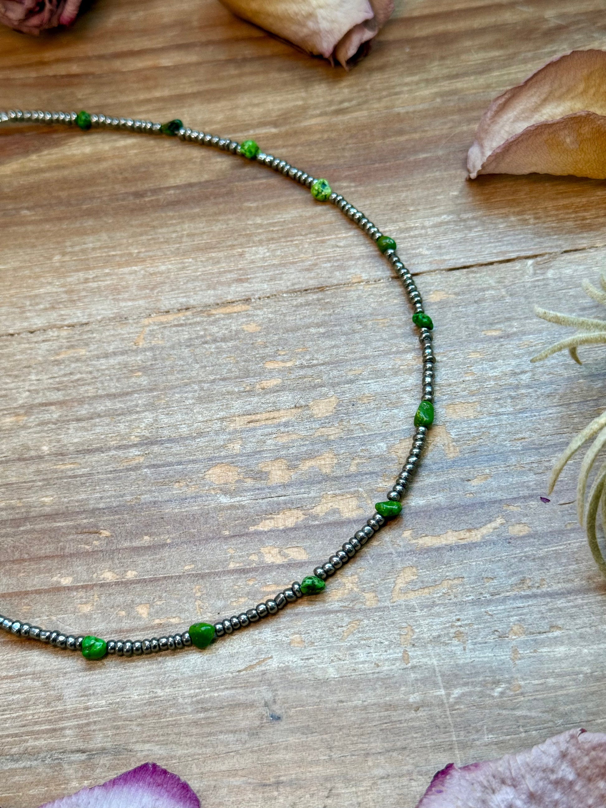 Green Turquoise Glass Seed Bead Necklace – 14 Inch