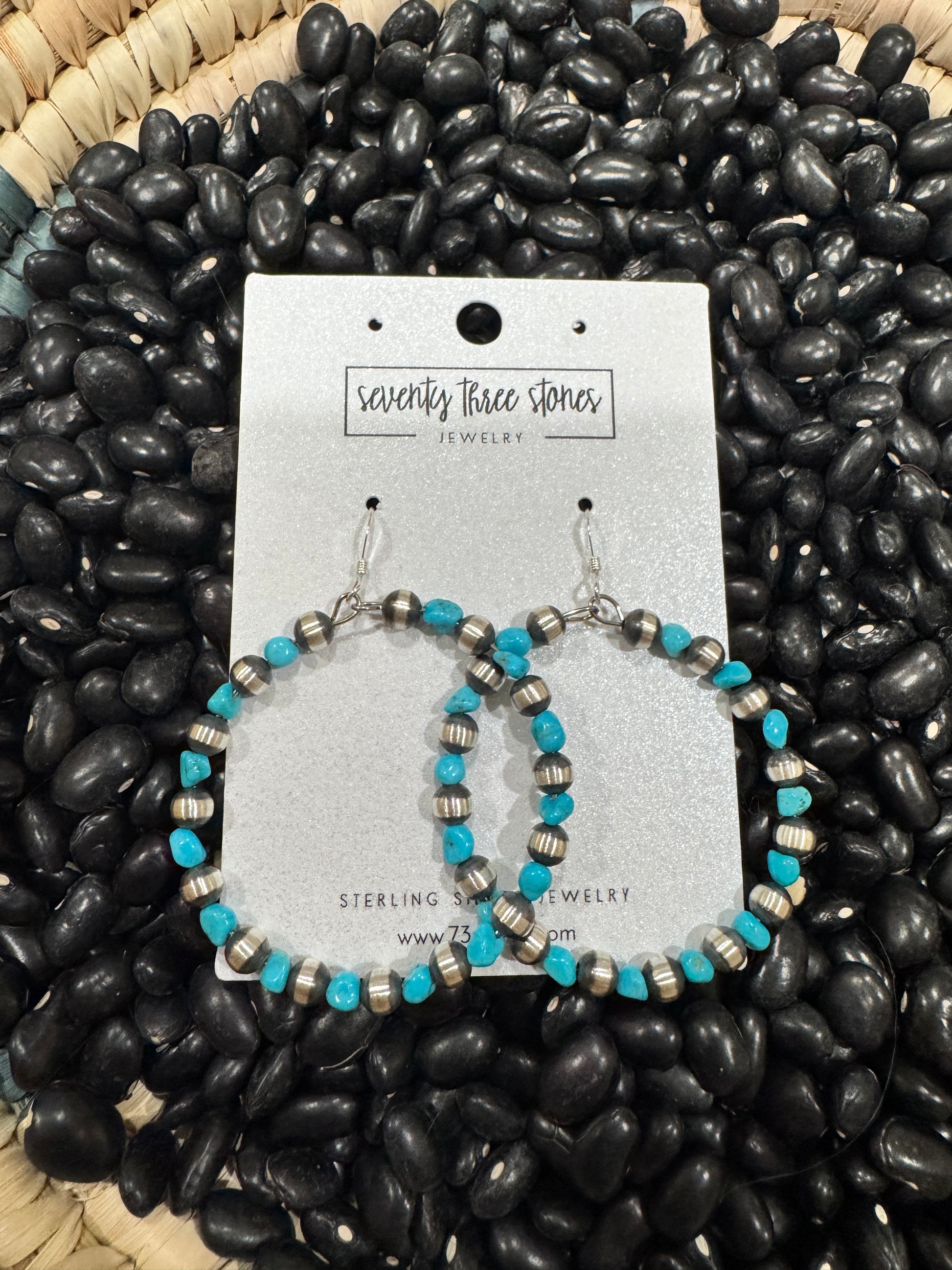 2" 5mm sterling pearls with turquoise nuggets round hoop earring