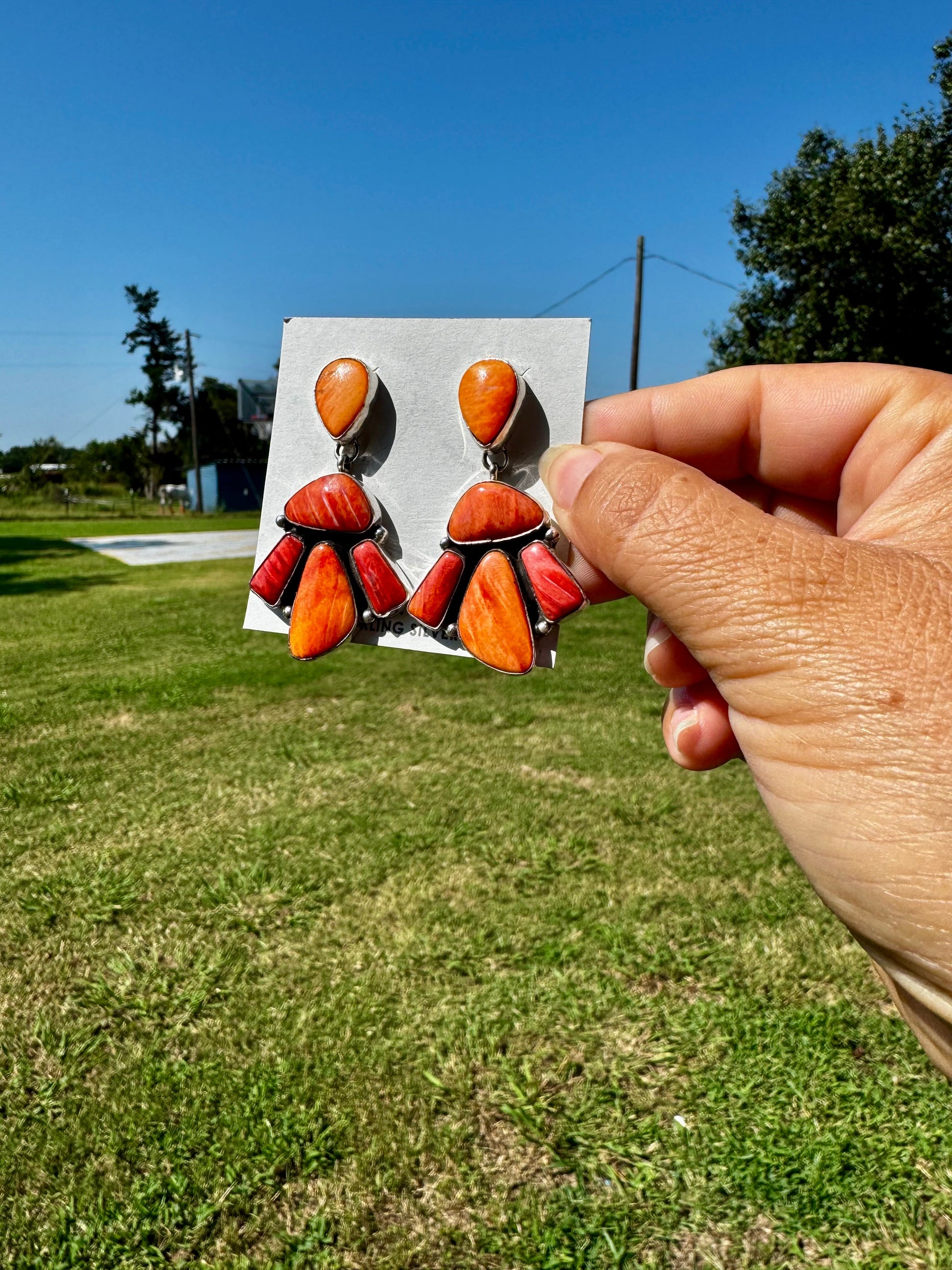 Bold, bright, and impossible to ignore. These handcrafted cluster earrings feature vibrant orange and spiny oyster stones arranged in a classic dangle style with a stud post backing. Made by Navajo artist Marcella James, this one-of-a-kind pair brings heritage craftsmanship and a statement-making style together. Whether you're dressing up or standing out, these earrings are designed to turn heads.