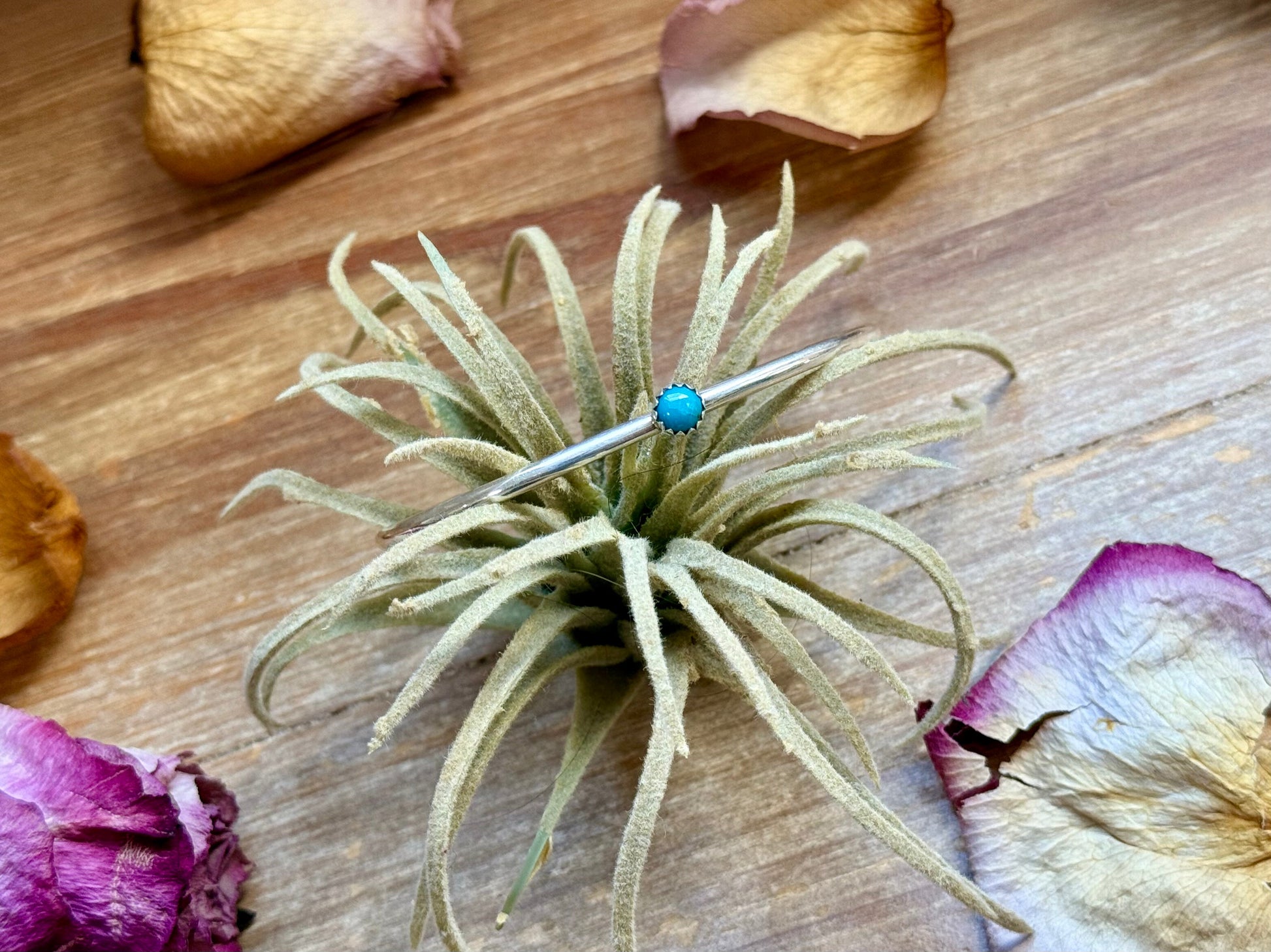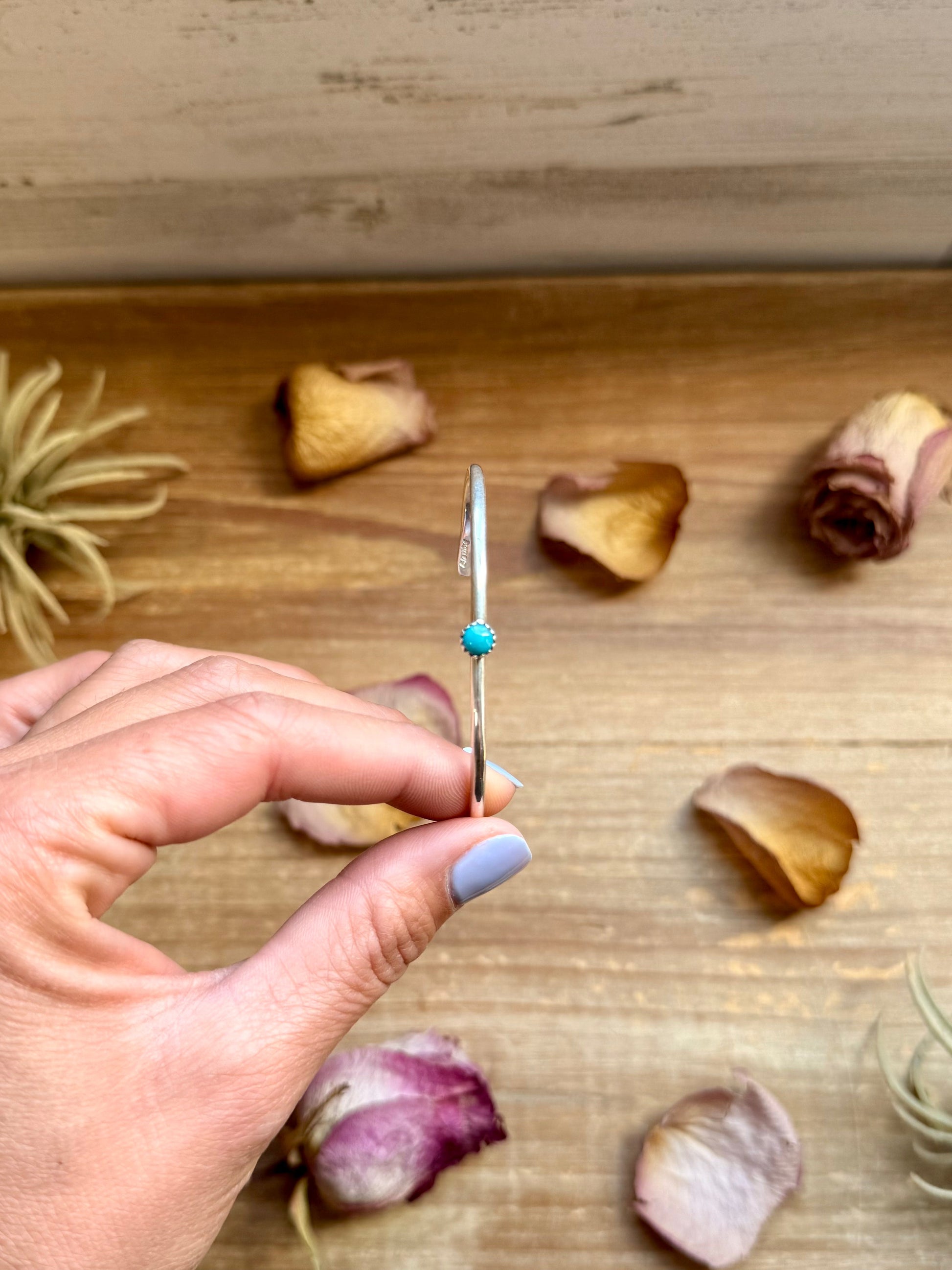 This Native made sterling silver cuff bracelet features a genuine Kingman turquoise stone with beautiful blue hues and a natural matrix. Handcrafted and stamped “G.S.” and “Sterling,” this cuff is designed for a smaller wrist and has a slight natural give for comfortable wear. Each piece is handmade in the USA and slightly unique, showcasing the skill and tradition of authentic Native silversmithing.