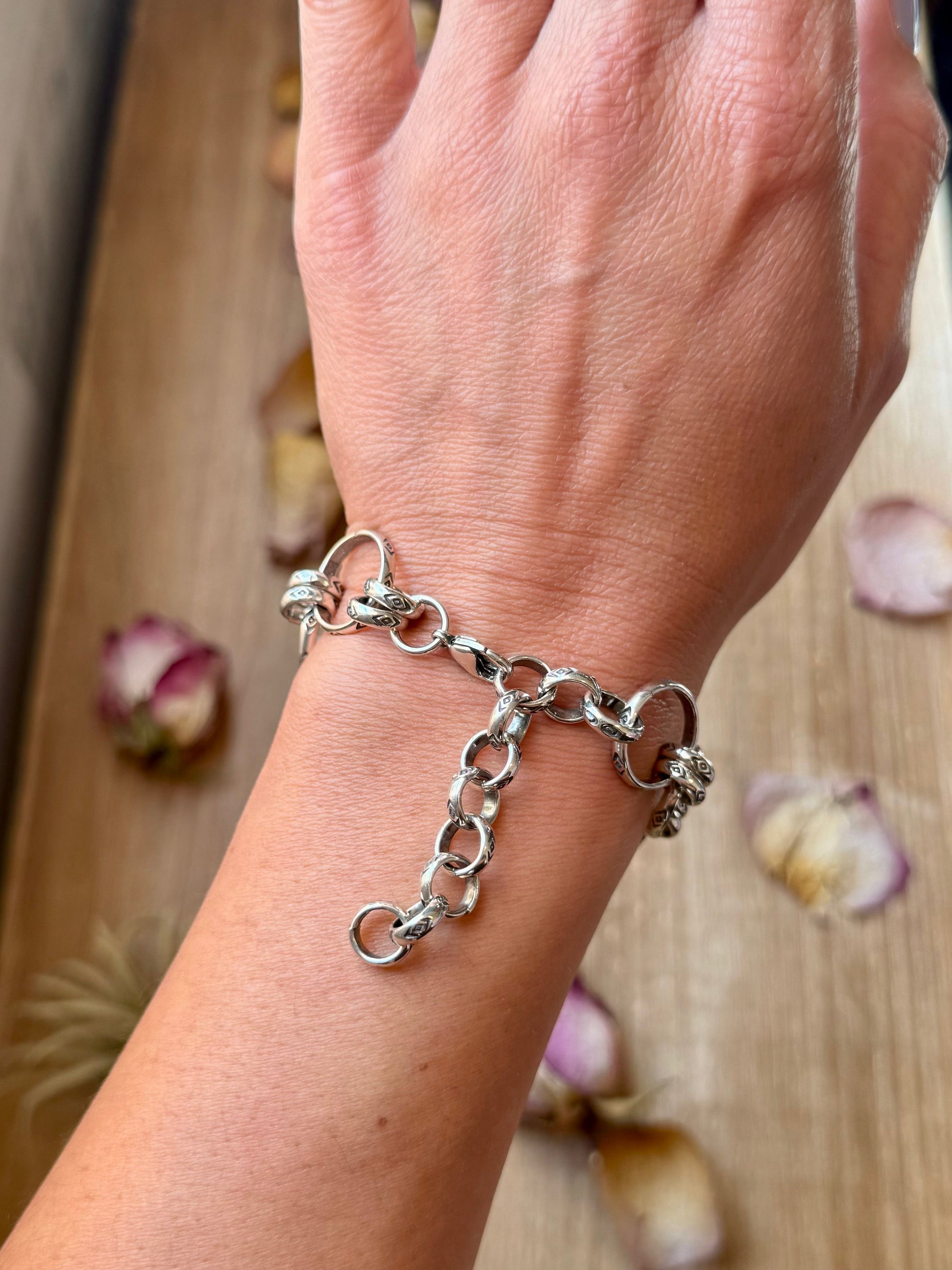 This sterling silver charm chain bracelet by artist Jason Ogg features the signature Medicine Man Eye pattern hand-stamped along each link. Designed to fit a 7-inch wrist with a 2-inch extender, this piece combines durability with timeless Western detail. Each link is individually crafted and polished for a clean, bright silver finish — perfect for wearing alone or adding your favorite charms.