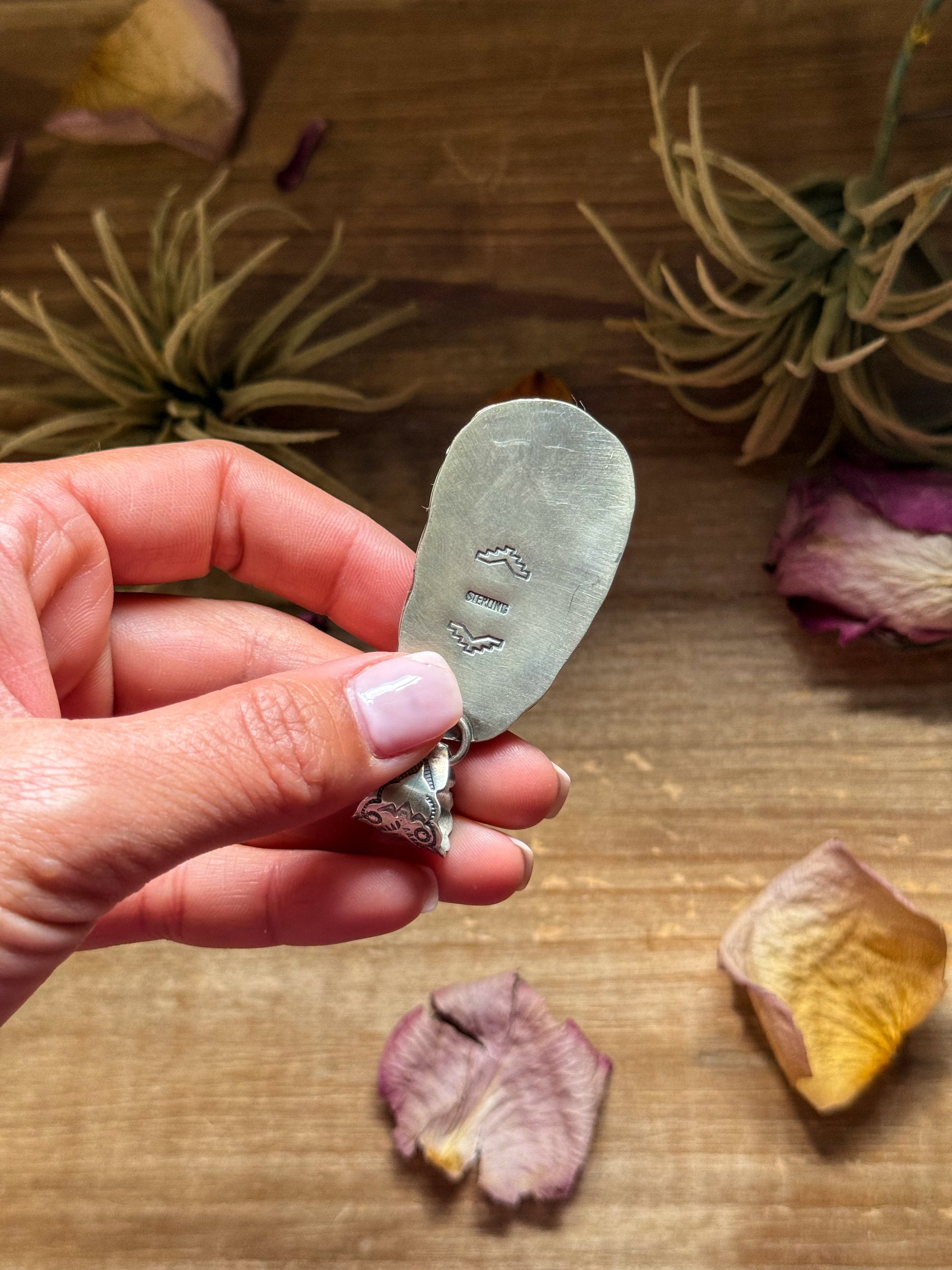 Handmade in New Mexico, USA, this White Buffalo pendant features a bold free-form stone with striking black-and-white contrast — a true signature of this rare gemstone. Set in solid sterling silver and stamped STERLING, each pendant showcases meticulous silversmith detailing that enhances the natural beauty of the stone.